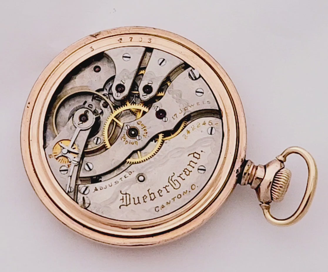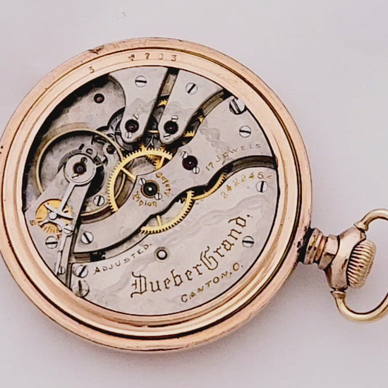 Produced in 1908, this Antique Hampden "Dueber Grand" Pocket Watch combines classic American craftsmanship with stylish design details. Featuring a 17-jewel pendant-set movement and a nickel finish, this 12-size timepiece is housed in a gold-filled case with an ornate design on the back cover. While it runs well and presents beautifully, it would benefit from a routine service to ensure lasting performance. A wonderful example of early 20th-century watchmaking with both aesthetic and functional appeal.