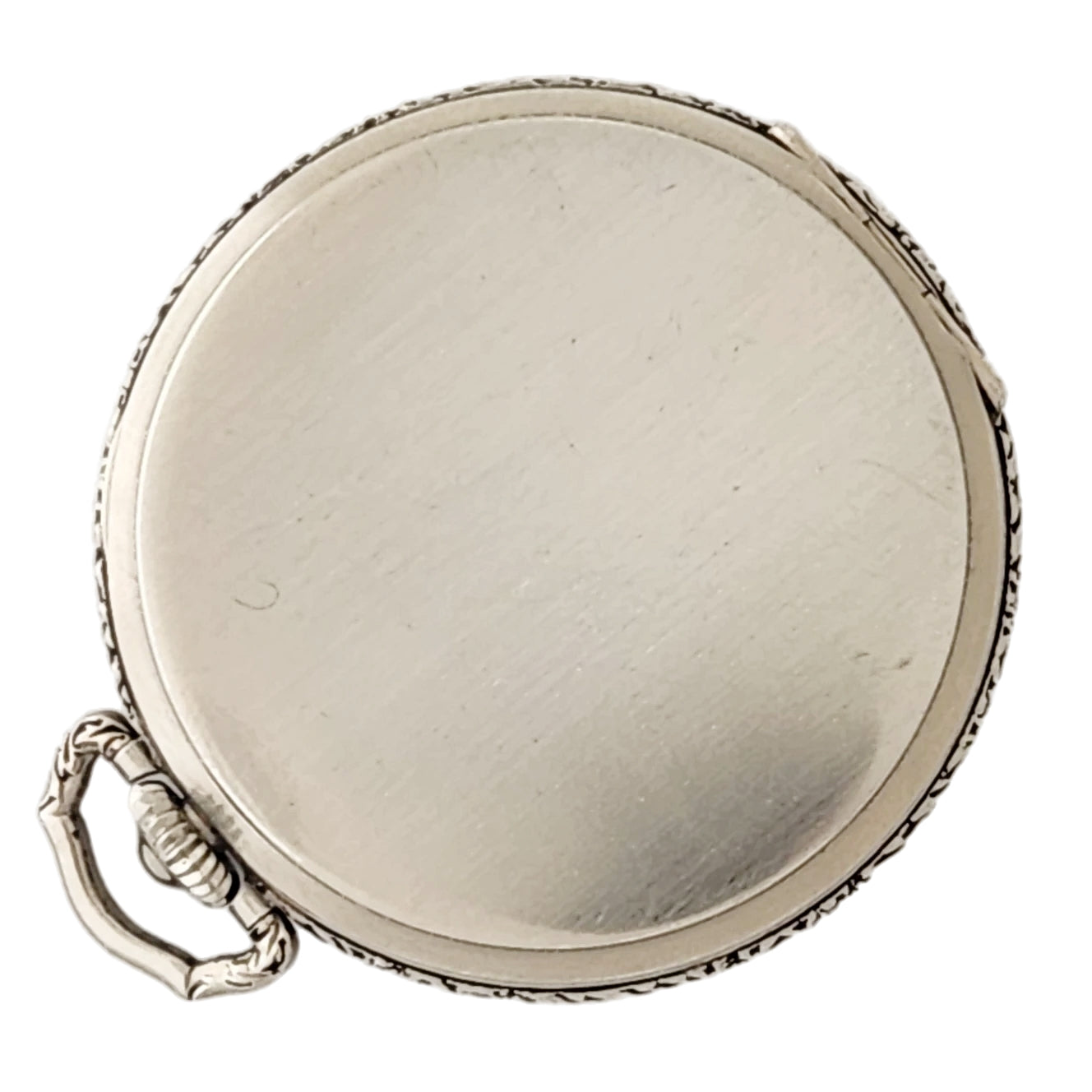 Case: About 45 mm (1-3/3 inches) wide, this nearly perfect case has a snap front cover and a hinged back cover. The front and back covers open and close. The bow and crown appear original, and the Waltham-signed 14kt White Gold Filled case appears original to the movement. The glass crystal is in nearly new condition as well.